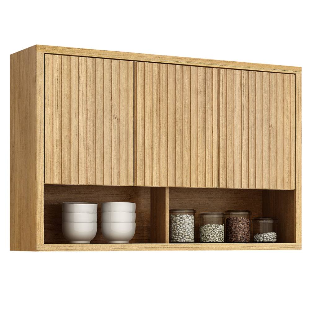 Os nichos inferiores permitem acesso rápido no dia a dia, enquanto as portas ripadas criam um toque decorativo único, combinando com cozinhas modernas e ambientes integrados.