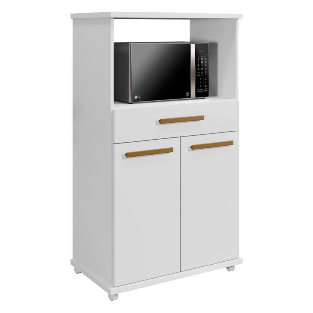 O destaque fica por conta do nicho superior para micro-ondas, que libera espaço na bancada e mantém os eletros ao alcance das mãos. Abaixo, o balcão conta com 1 gaveta e 2 portas com amplo espaço interno, ideal para guardar utensílios, mantimentos ou pequenos eletros.