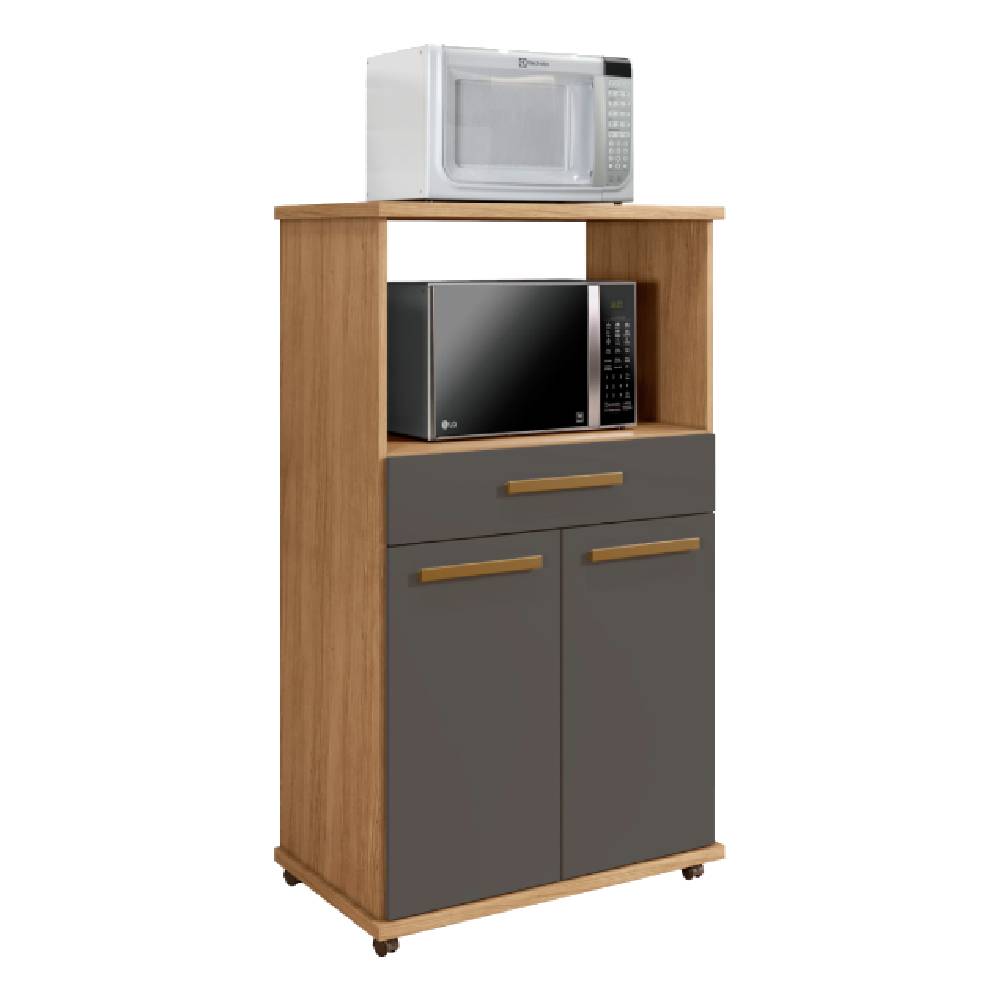 O destaque fica por conta do nicho superior para micro-ondas, que libera espaço na bancada e mantém os eletros ao alcance das mãos. Abaixo, o balcão conta com 1 gaveta e 2 portas com amplo espaço interno, ideal para guardar utensílios, mantimentos ou pequenos eletros.