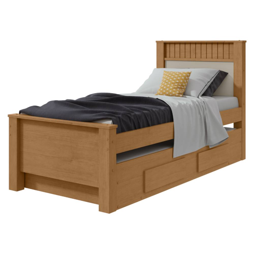 A cabeceira possui design elegante com frisos decorativos e painel em tonalidade Off White, adicionando profundidade visual ao ambiente. Compatível com colchão de 88x188 cm, a cama acompanha barra lateral em MDF 25mm e estrado em MDF 6mm. A cama auxiliar bibox com gavetas telescópicas otimizam o espaço.
