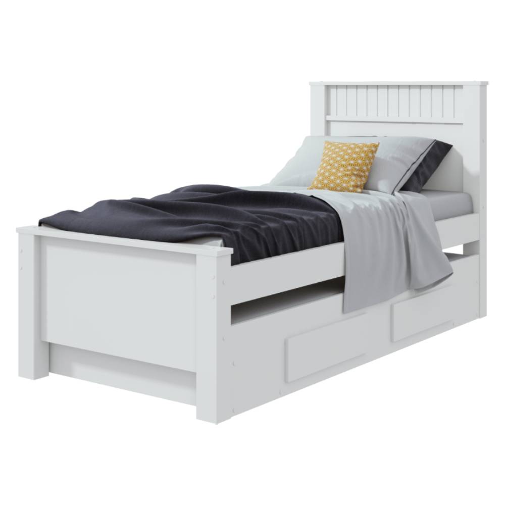 A cabeceira possui design elegante com frisos decorativos e painel em tonalidade Branco, adicionando profundidade visual ao ambiente. Compatível com colchão de 88x188 cm, a cama acompanha barra lateral em MDF 25mm e estrado em MDF 6mm. A cama auxiliar bibox com gavetas telescópicas otimizam o espaço.