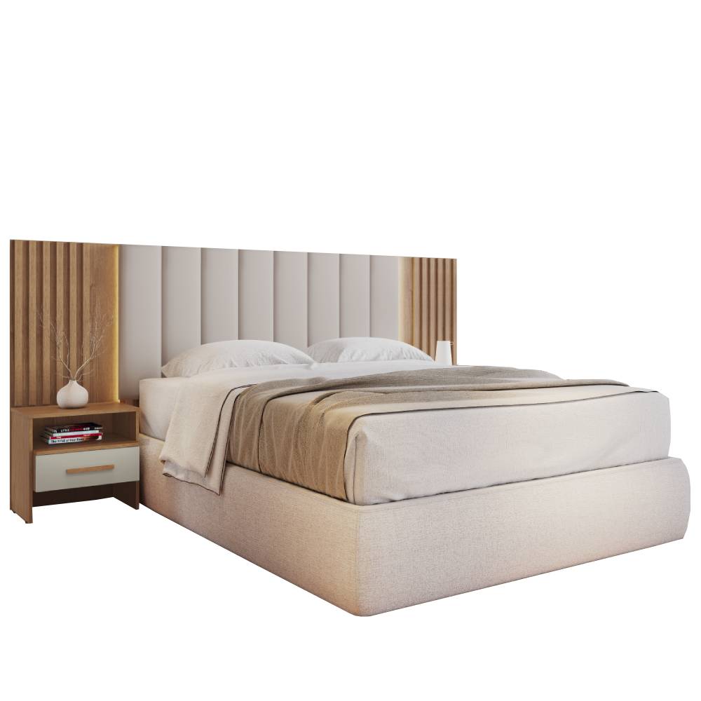 O painel estofado com encosto almofadado garante conforto, enquanto os detalhes ripados em MDF e a iluminação em LED embutida criam um visual moderno e acolhedor. Para completar, as duas mesas de cabeceira integradas com gavetas de corrediças telescópicas oferecem praticidade no dia a dia — perfeitas para manter o essencial sempre por perto.