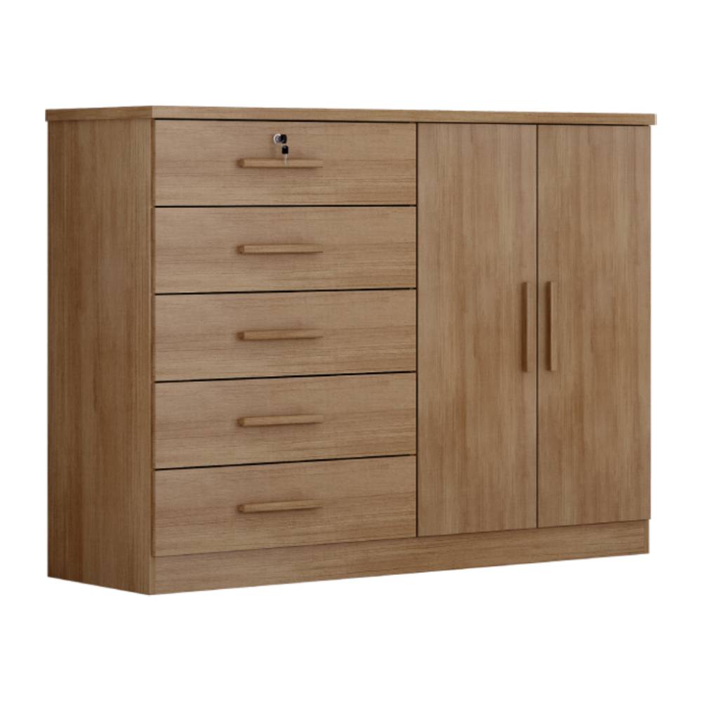 Com 5 gavetas amplas equipadas com corrediças telescópicas que permitem abertura total, ela oferece espaço otimizado para roupas, acessórios e itens pessoais. A gaveta superior possui fechadura com chave, garantindo segurança extra. As duas portas laterais abrem para um compartimento com 3 prateleiras internas, ideais para itens maiores ou dobrados.