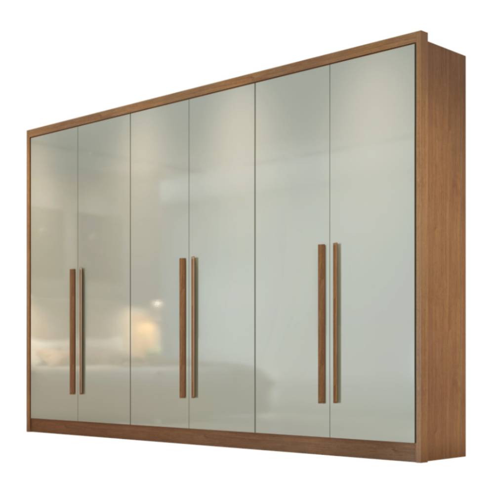 Seu amplo espaço interno foi pensado para atender às necessidades de casais, com divisões "ele e ela", cabideiros, calceiro em alumínio e oito gavetas internas com corrediças telescópicas que garantem deslizamento suave e maior durabilidade. As seis portas com abertura por batente e puxadores amadeirados verticais reforçam o visual robusto e moderno do móvel.