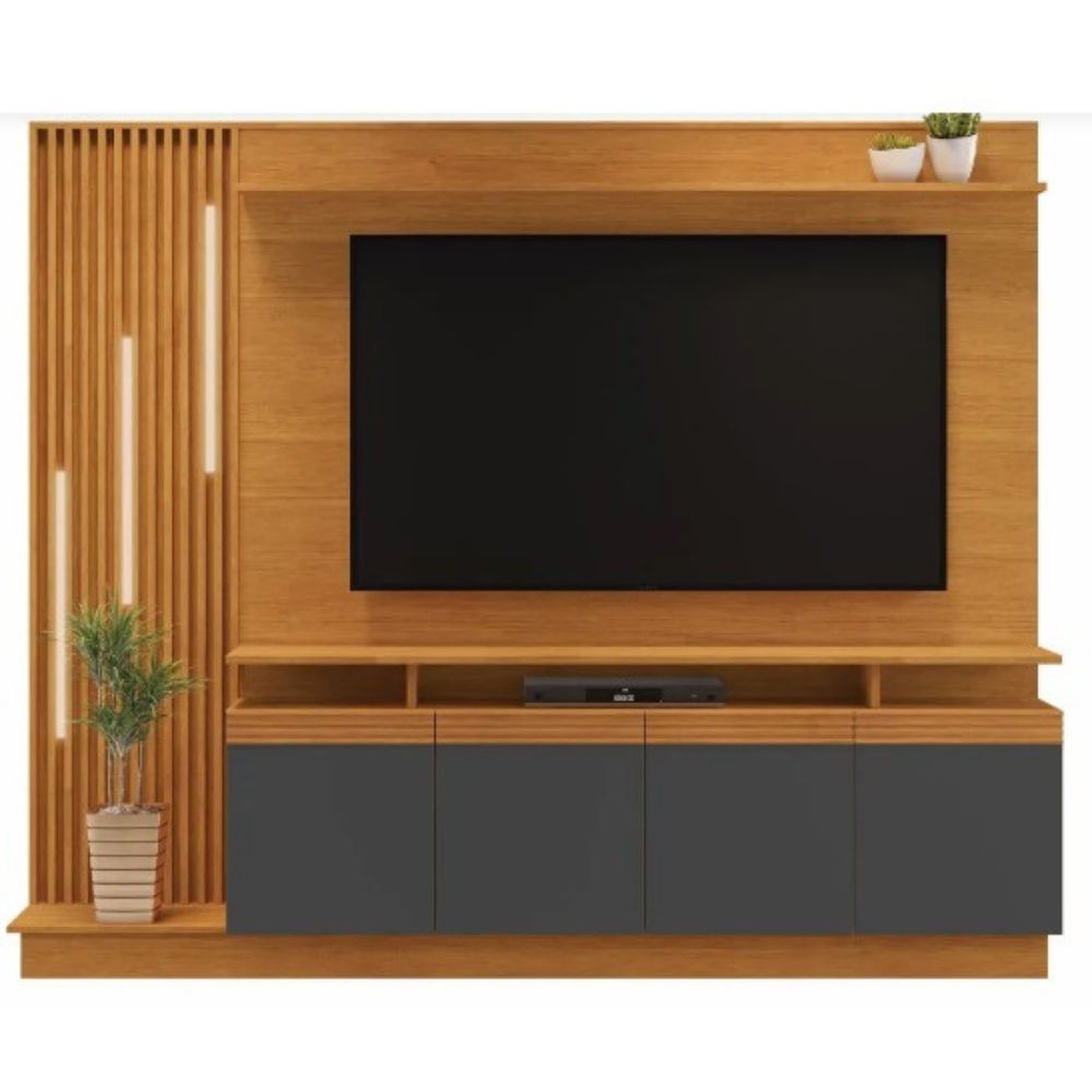 Este home possui espaço para TVs de até 75", prateleiras amplas para eletrônicos, nichos decorativos e iluminação LED embutida no painel ripado, proporcionando um visual elegante e aconchegante.