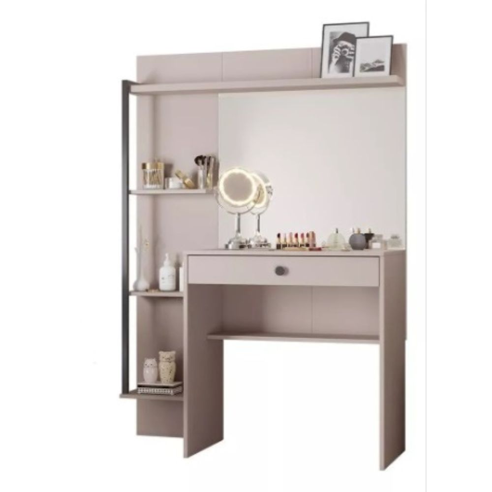 A Penteadeira Camarim Encanto é produzida em 100% MDP, garantindo robustez e excelente qualidade estrutural. Possui gaveta ampla com trilho telescópico, oferecendo abertura suave e resistência ao uso diário. A colmeia organizadora integrada facilita a disposição de maquiagem, joias e outros itens pessoais. O espelho de grandes proporções valoriza a iluminação e permite uma experiência completa de autocuidado. Suas prateleiras laterais trazem espaço adicional para armazenar objetos decorativos, perfumes e acessórios, mantendo o ambiente elegante e funcional.